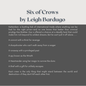 Ketterdam: a bustling hub of international trade where anything can be had for the right price—and no one knows that better than criminal prodigy Kaz Brekker. Kaz is offered a chance at a deadly heist that could make him rich beyond his wildest dreams. But he can’t pull it off alone. . . .