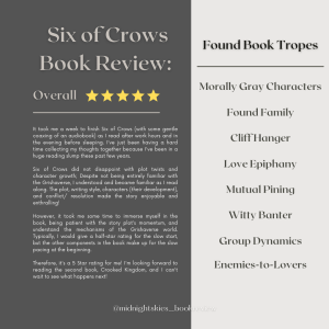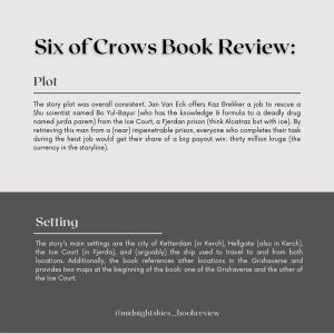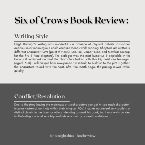 Six of Crows did not disappoint with plot twists and character growth; Despite not being entirely familiar with the Grishaverse, I understood and became familiar as I read along. The plot, writing style, characters (their development), and conflict/ resolution made the story enjoyable and enthralling!