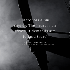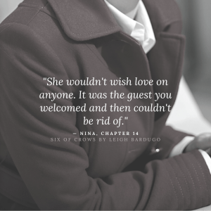 Nina was a wonderful POV character to read, too! And even though she has so much humorous dialogue, this one is one of my favorites from her. This quote succinctly explains both love and heartbreak and the pain of it all. This quote comes after Kaz gouged out Oomen’s eye and threw him overboard after hurting Inej with a grave injury. After the bloody delivery of Kaz’s ruthless actions, Nina bemusedly wonders if Kaz did it under the pretenses of love for Inej. I think this quote illustrates how there are things like love are out of our control. This quote is a reflection and (arguably) a foreshadowing of the different dynamics of love and how they were not searching for love but found it somehow.