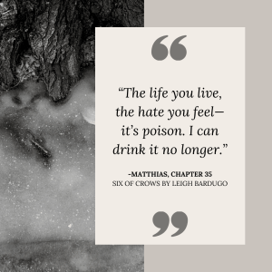 Matthias was a character who grew on me while reading Six of Crows, and the reason I grew to like him is based on his character growth. I related to him in the sense of being unaware in my youth about what others had told me to be the truth – and then discover later on to be more complex, layered, and not entirely accurate. This is one of my favorite quotes because it shows how Matthias has grown from his national/ religious views on hating Grisha. He calls hate a “poison” he can no longer drink because he understands the errors and wrongs his country has done to all Grisha. The quote resonates with hope for those wanting to grow, learn, and change than stay willfully ignorant and hateful to others.