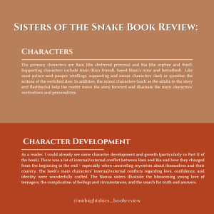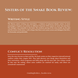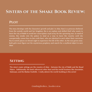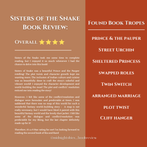 Sisters of Snake was a beautiful Prince and the Pauper retelling! The plot twists and character growth kept me wanting more; The inclusion of Indian culture and cuisine was so beautifully done to craft the story’s colorful and vibrant world! I enjoyed the character development and world-building the most! The plot and conflict/ resolution enticed me into reading the story!
