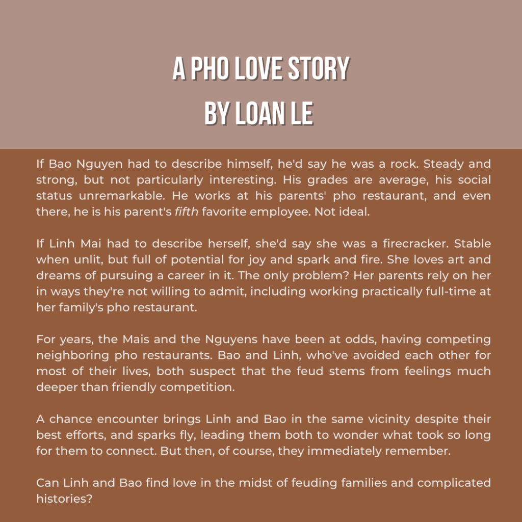 - PLOT: The story centers on Bao and Linh and their growth throughout the story. Bao and Lin have parents who own rivaling pho restaurants across from each other, and both were expected to keep their distance. Bao is searching for direction in his future, whereas Linh already knows she wants to be an artist. An unexpected turn of events makes them cross each other’s paths and form a secret friendship without their families’ knowing. As their feelings grow and the desire to unravel the mystery of their families’ feud with each other, Bao and Linh come to understand their families, themselves, and their community to mend old wounds and form new futures.