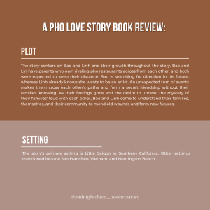- CONFLICT/ RESOLUTION: Since the story focuses on Bao and Linh, the book centers on their respective internal/external conflicts within their chapter POV. They both discover new things about themselves, their motivations, and their families and understand them all in the story’s progression. One critique I have is how the family feud that began with their families stemmed from miscommunication.