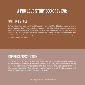 - WRITING STYLE: Le’s writing style was one that I thoroughly enjoyed! The Chapters were written in dual Character POVs (point of view): Bao and Linh. The dialogue was enjoyable and realistic while mentioning mainstream pop culture and references without making it cringey. The medium pacing of the story builds up the plot and conflict in the story and the primary character’s growth. Some scenes and dialogues made me cry and outright laugh out loud!