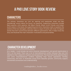 - CHARACTER DEVELOPMENT: As a reader, I could already see some character development and growth (particularly in Part II of the book). There was a lot of internal/external conflict between Bao and Linh detailed in their respective chapters and perspectives. The book beautifully depicted Bao’s and Linh’s internal/external conflicts regarding their future aspirations, families, community, and love. Le illustrates young love’s beautiful growth, community support, and familial connections and understanding.