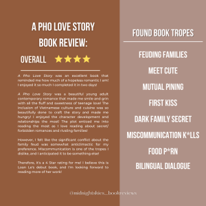 A Pho Love Story was a beautiful young adult contemporary romance that made me smile and grin with all the fluff and sweetness of teenage love! The inclusion of Vietnamese culture and cuisine was so beautifully done to craft the story and made me hungry! I enjoyed the character development and relationships the most! The plot enticed me into reading the most as I love reading about secret/ forbidden romances and rivaling families!