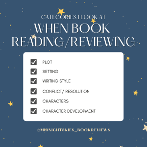 Why these six categories? These are the categories I typically look for when reading fiction, whether its a standalone book or a new series. The categories keep me focused on the plot, the characters, and their goal in the book. It helps me organize my thoughts and reflect back on what I might have liked or disliked about the book to give a genuine review to readers.